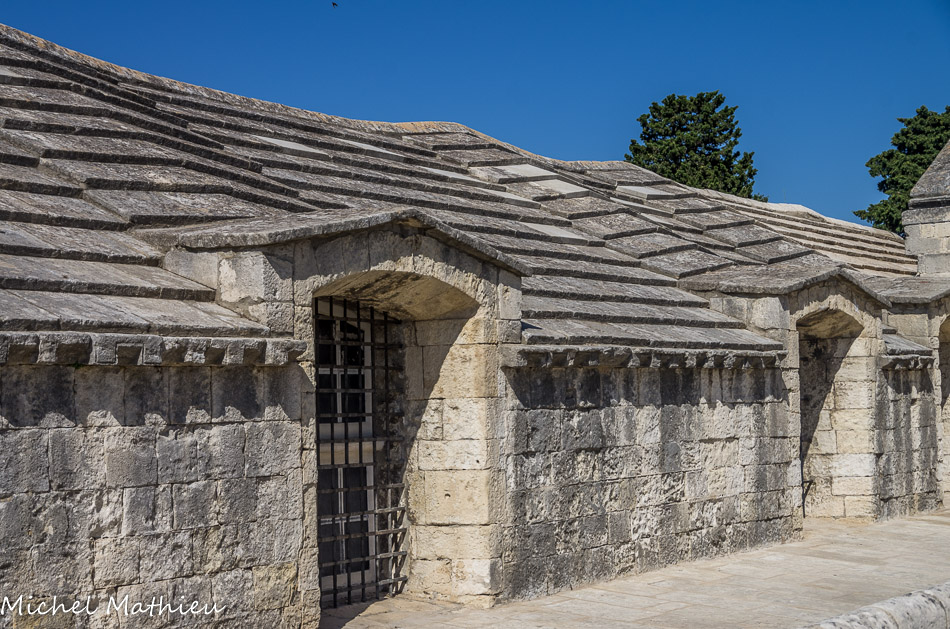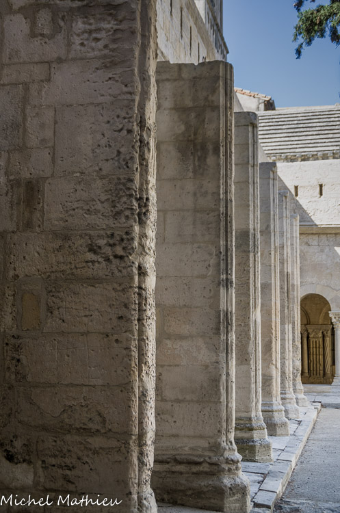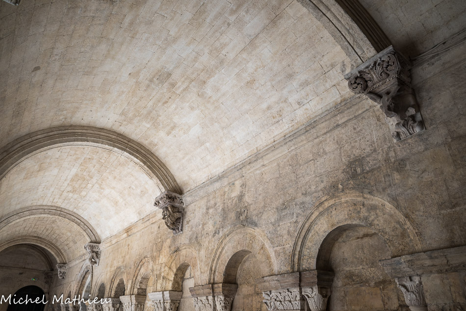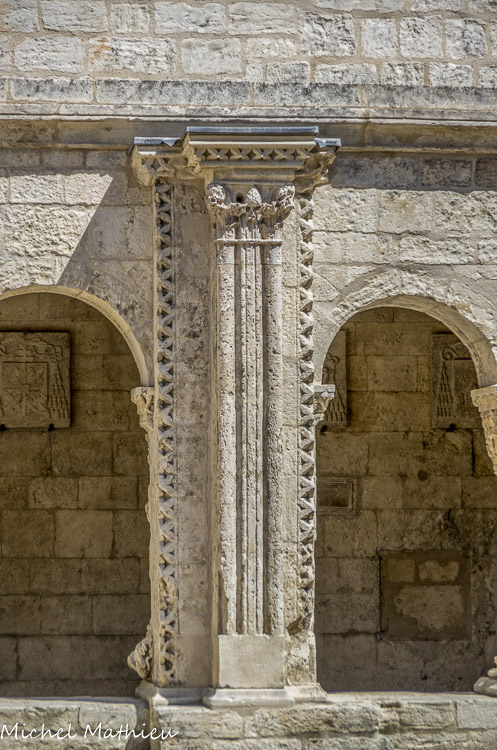 Galerie romane Nord. Elle s'ouvre sur la cour centrale par trois séries de quatre petites arcades en plein cintre que séparent des contreforts à pilastres cannelés à la romaine. Le coin gauche est le plus élevé, c'est de là que partent les corniches qui récupèrent l'eau de pluie.