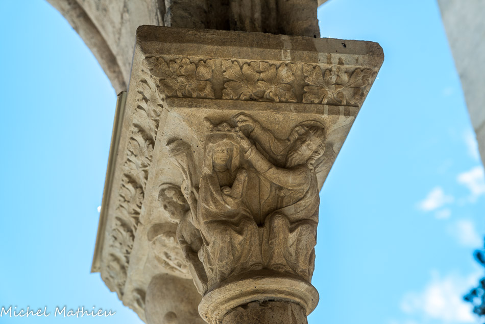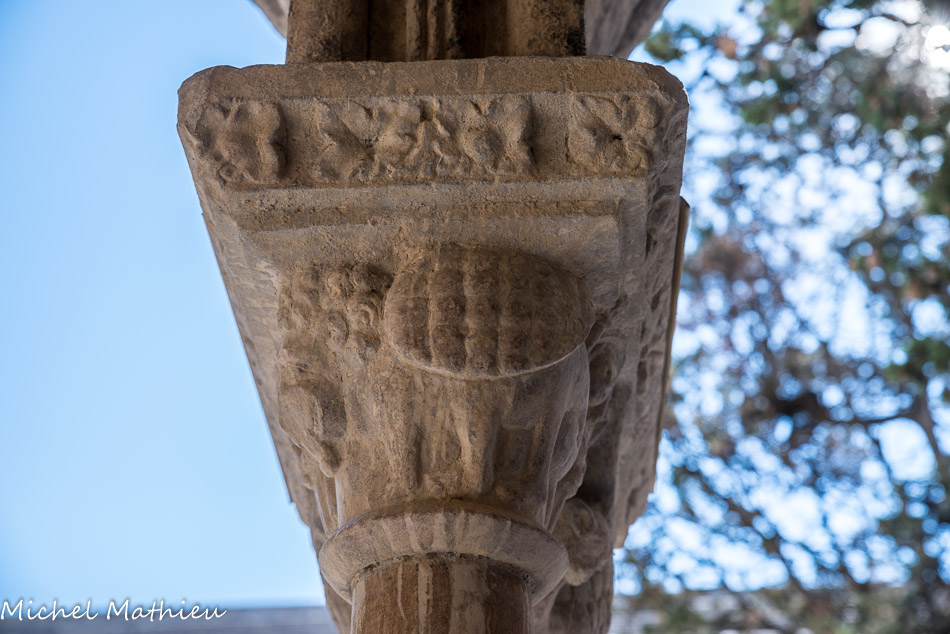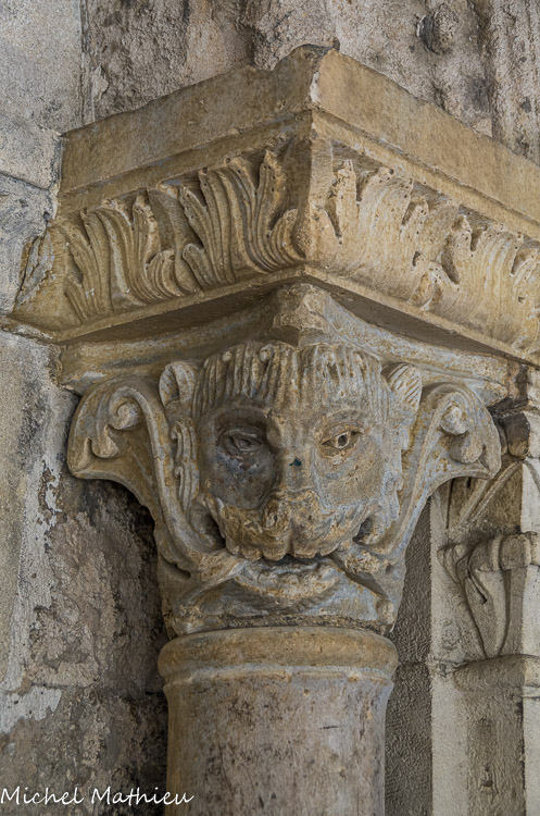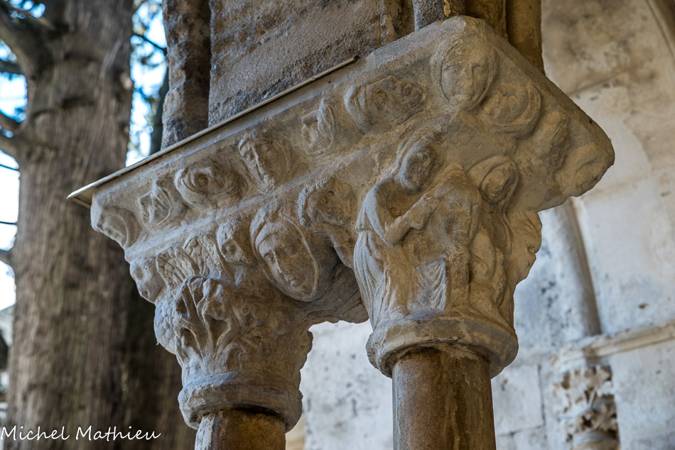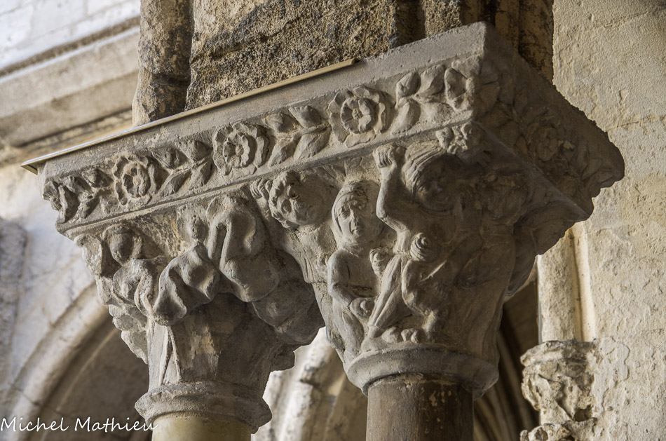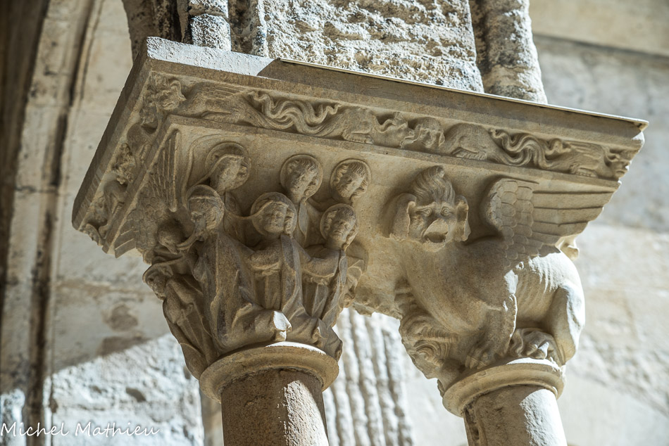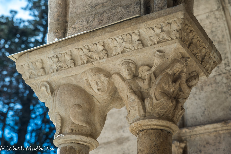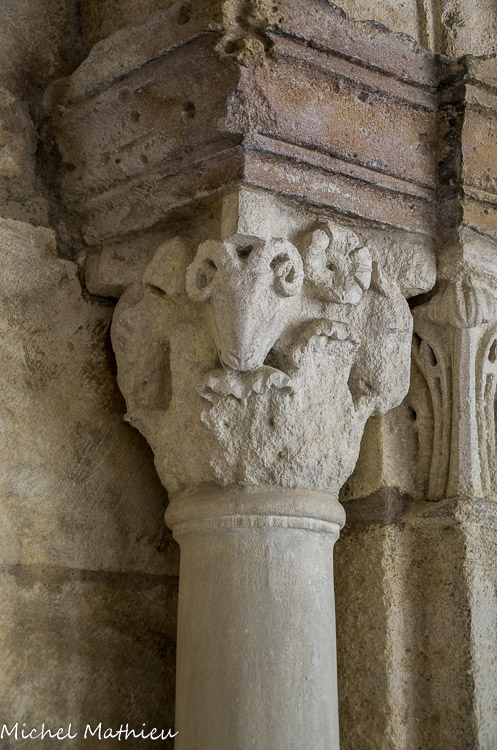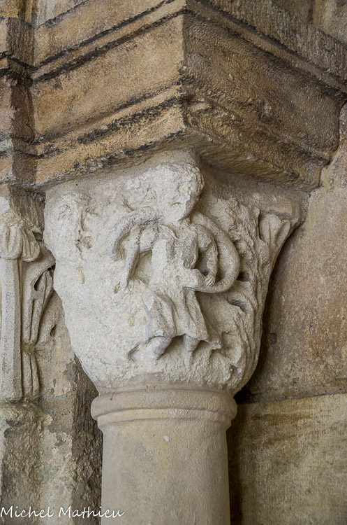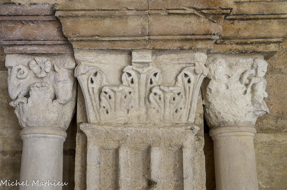 Galerie Ouest. Les faces extérieures des chapiteaux, rarement historiés en général, sont, comme celui-ci, à feuillage.