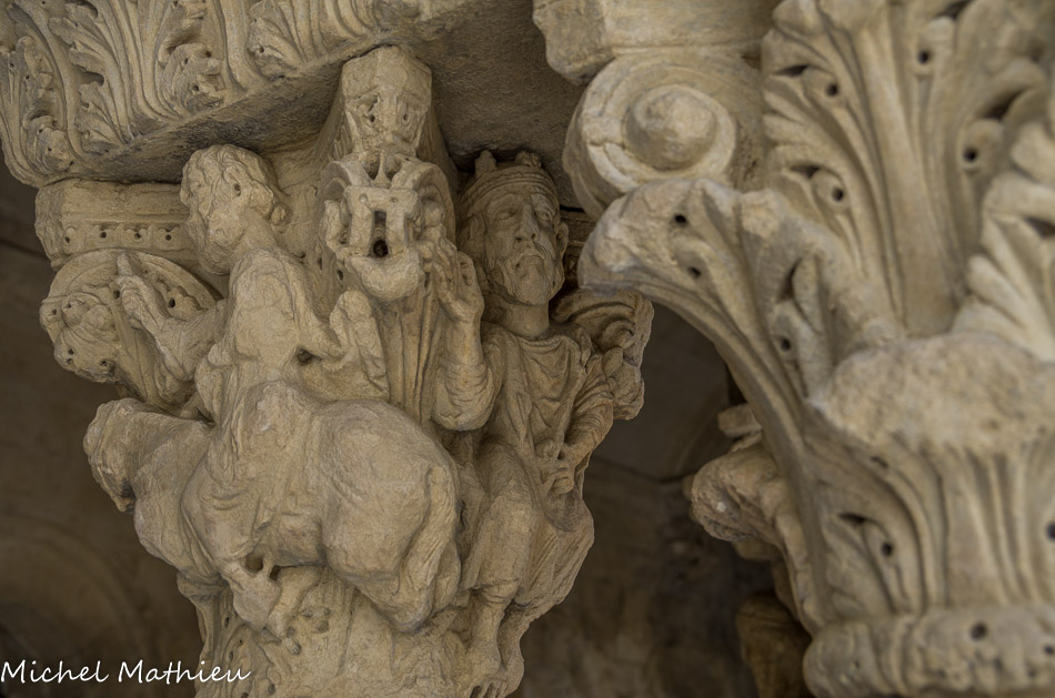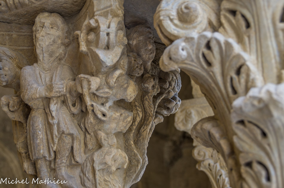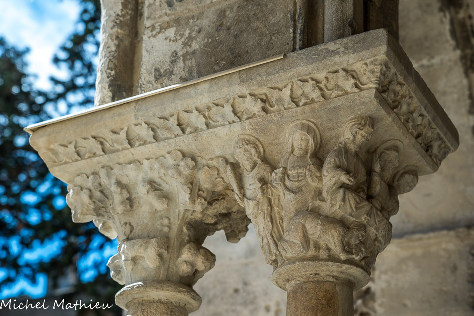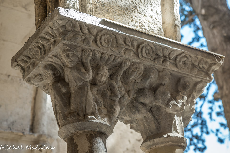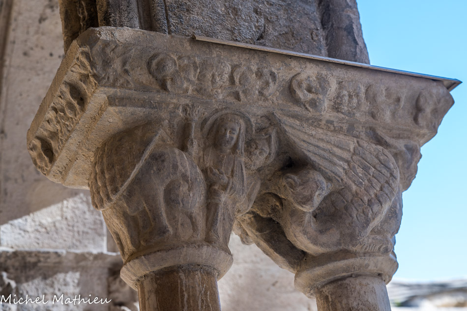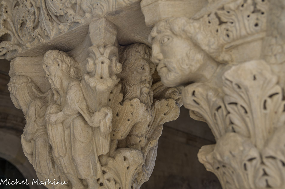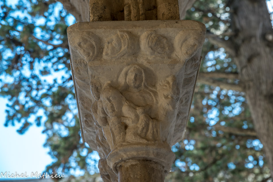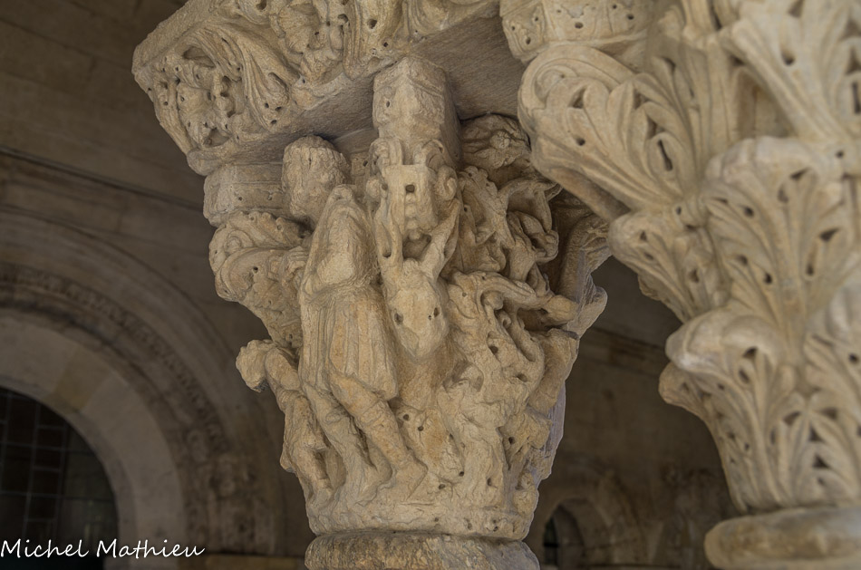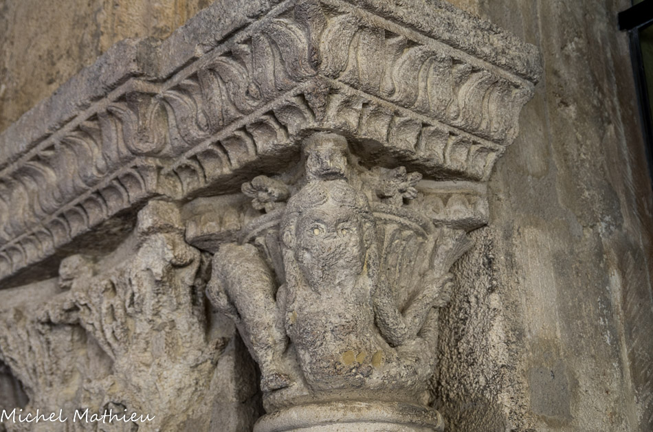 Galerie Ouest. Les faces extérieures des chapiteaux, rarement historiés en général, sont, comme celui-ci, à feuillage.