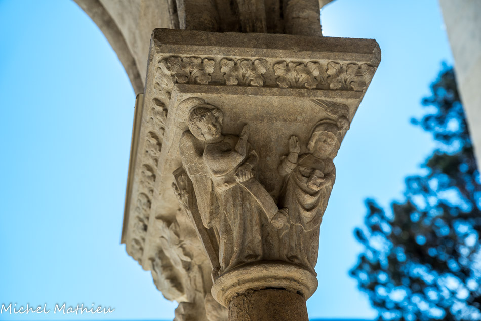 galerie Nord. Deux anges se présentent à Abraham, dans la vallée de Mambré et annoncent à Sara qu'elle sera mère. Chapiteau à trois rangs de feuilles d'acanthe