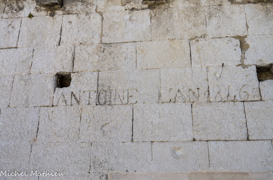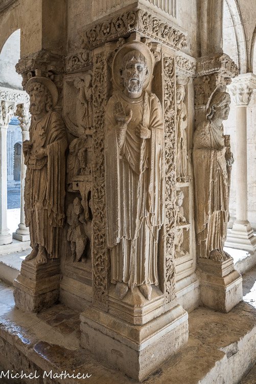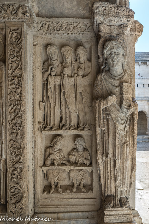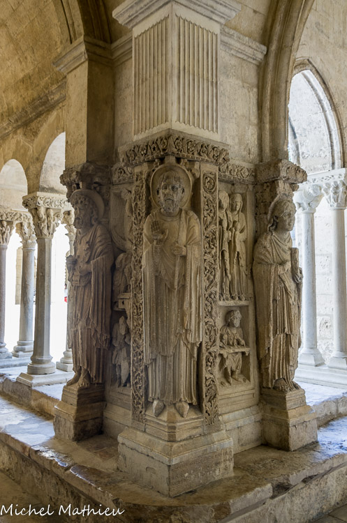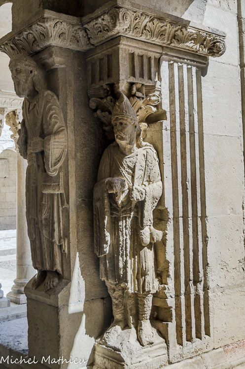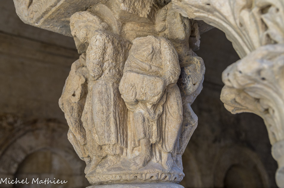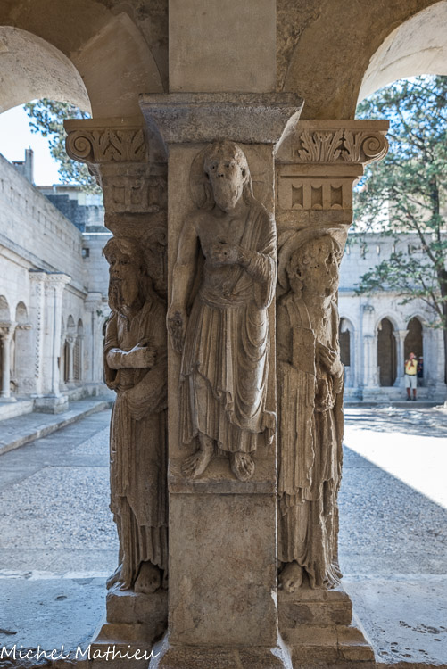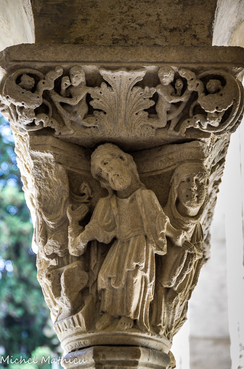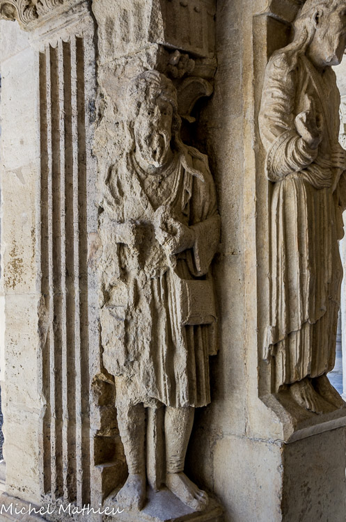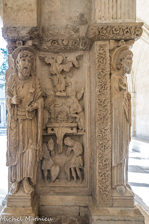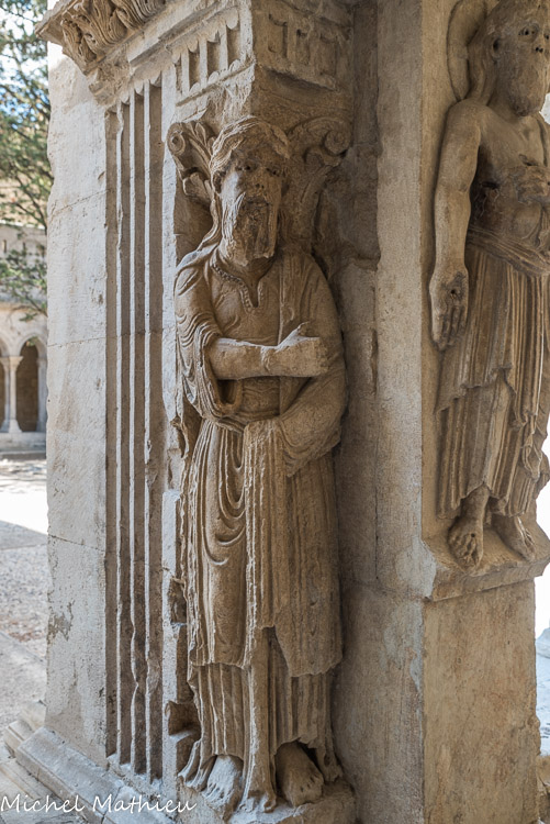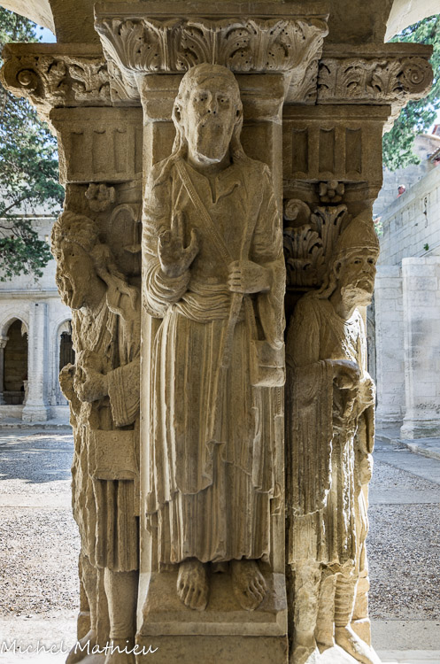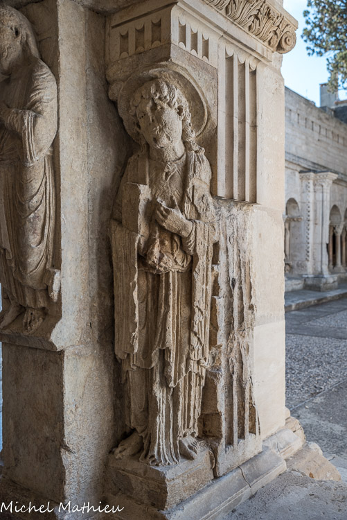 galerie Nord. Ce pèlerin porte le bâton de pèlerin en tau et la gourde du pèlerin ; Il est chaussé de sandales ; il est coiffé d’un bonnet avec une coquille, évocation du pèlerinage à Saint-Jacques-de-Compostelle dont Arles était une étape.