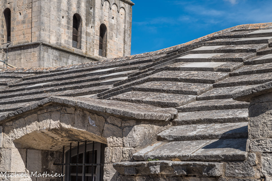 Au-dessus des galeries court un promenoir dominé par les belles toitures en dalles calcaires posées en imbrication des salles canoniales.