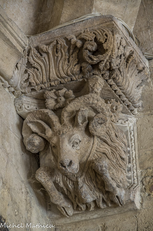 galerie Nord. Console supportant la retombée externe du doubleau d'angle, simplement chanfreiné, représentant un avant-corps de bélier, les pattes repliées, portant une clochette à son cou.
