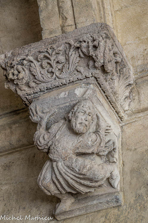 galerie Nord. Console représentant un acrobate, la tête en bas. Doubleau de section carrée, chanfreiné de deux tores.
