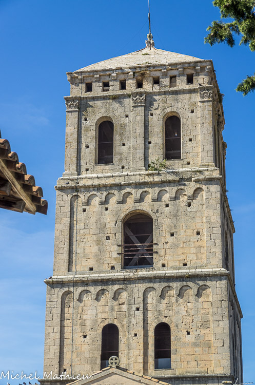 Le clocher roman, haut de 42 m et de section carrée comprend trois étages en retrait les uns sur les autres et un quatrième étage très court. Les deux premiers étages sont ornés de bandes lombardes, le troisième de pilastres à chapiteaux corinthiens.La toiture est pyramidale à faible pente.