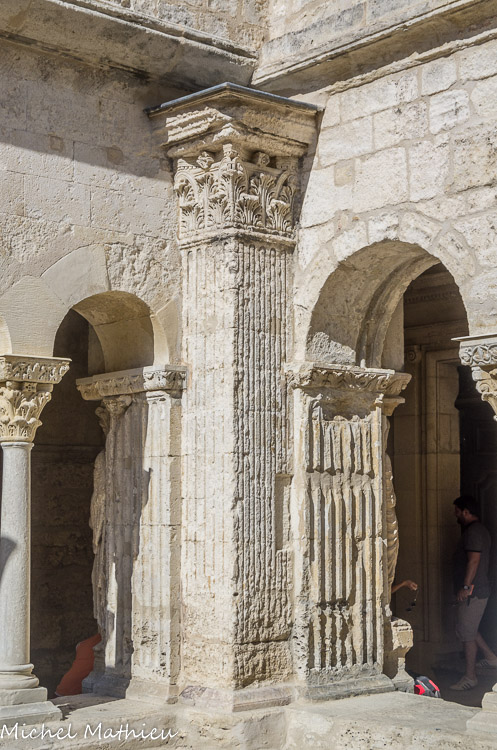 Contrefort extérieur du pilier d'angle. Son chapiteau porte un fleuron à serpentin sur le modèle de ceux de la Maison Carrée, imités également sur un chapiteau de l'église des Saintes-Maries-de-la-Mer.
