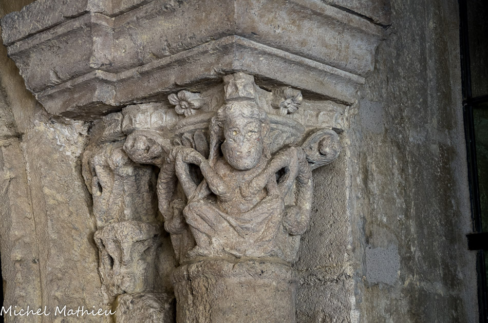 Galerie Nord. La luxure. Deux serpents, qui s'enroulent sur la corbeille du chapiteau, mordent au sein une femme accroupie.