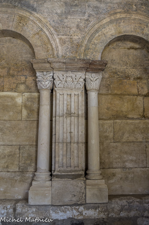 Galerie romane Est. Une des deux colonnettes est à section hexagonale, bases d'un seul tenant, à deux tores inégaux.