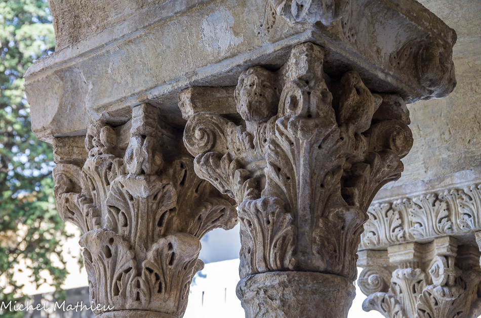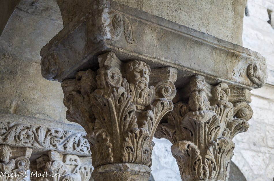 galerie Nord. Chapiteau à trois rangs de feuilles d'acanthe. Chapiteau à deux rangs de feuilles d'acanthe. Deux têtes humaines forment les fleurons sur les faces latérales.