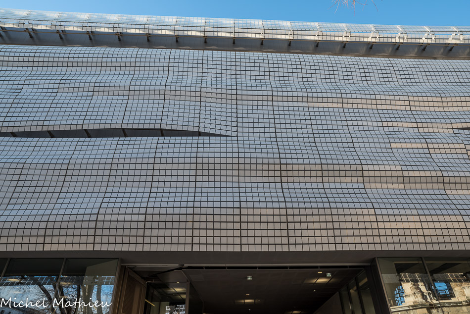 Composé de 7 000 lames de verre translucide, le drapé souple de la façade conjugue la transparence moderne et la tradition d’un art majeur romain : la mosaïque. Elle évoque ainsi un élément central des collections du musée. Les reflets et les ondulations de cette mosaïque de verre évoluent selon les différents moments de la journée. Œuvre dans l’œuvre, la façade est animée par des reflets cinétiques, avec des variations subtiles en fonction de l’angle, des inclinaisons, des creux et bombés, qui accentuent son mouvement et la métamorphosent sans cesse au fil des heures et des saisons.