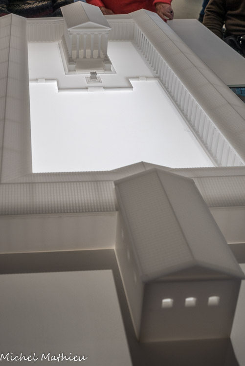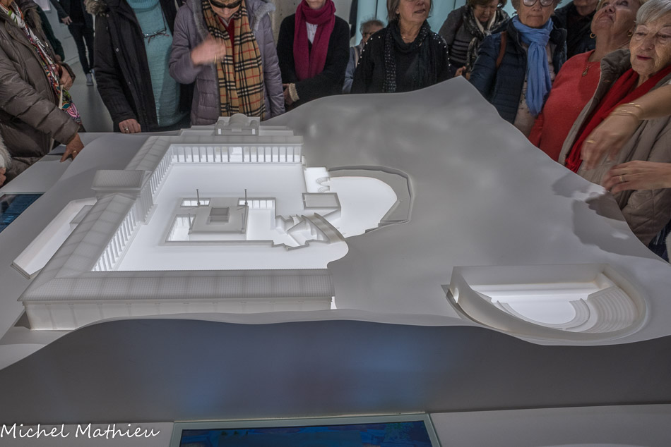 Le bâtiment et le parcours muséographique s’organisent autour d’une rue intérieure qui s’inscrit sur les traces de l’ancien rempart d’Auguste, premier empereur romain. En son centre, un atrium de 17 m de haut révèle un fragment du propylée du Sanctuaire de la Fontaine, dans une reconstitution spectaculaire de ce lieu sacré datant de la fondation de la cité pré-romaine.