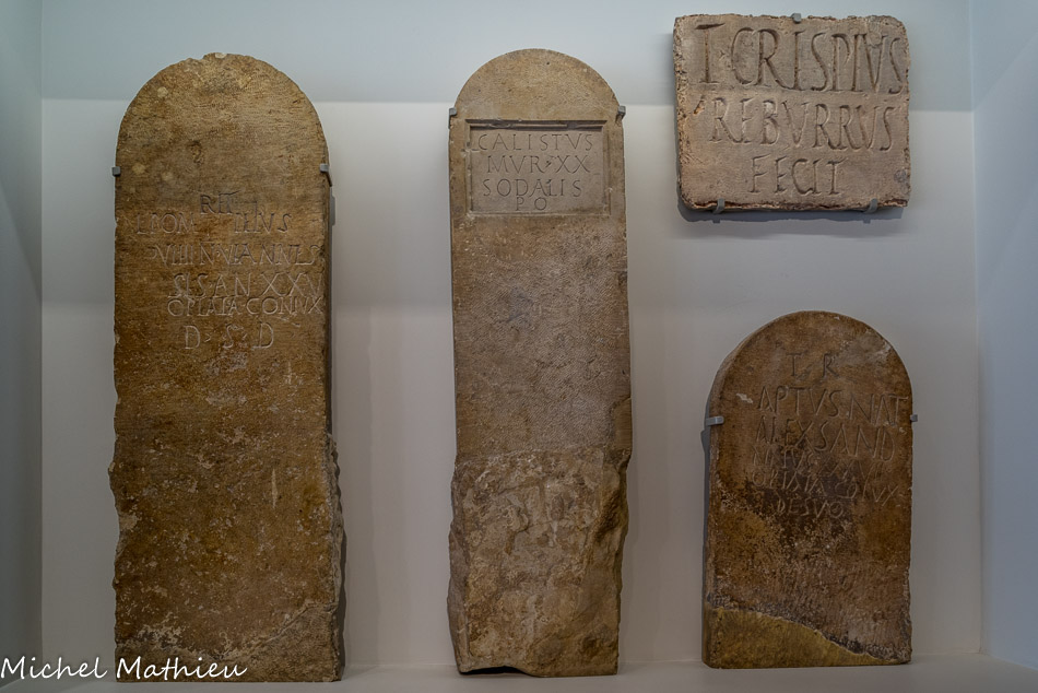 Inscription de T. Crispius Reburrus (moulage). « Titus Crispius Reburrus a fait». Cette inscription gravée sur une plaque en calcaire est insérée, en deux exemplaires dans les parements des murs des galeries aménagées dans le sous-sol des Arènes. Elle indique probablement le nom de l'architecte qui a réalisé ces espaces techniques dont la fonction était liée à l'organisation des spectacles programmés dans l'amphithéâtre.