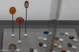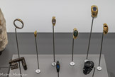 Au fond, Oenochoé subgéométrique. Le Marduel, St Bonnet (Gard) Troisième quart du Ve siècle av. J.-C. et Urne non tournée avec couvercle. Roque de Viou, St Dionisy (Gard) Première moitié du IVe siècle av. J.-C.. Au milieu, Trousse de toilette en fer (spatule, pince à épiler, scalptorium). Roque de Viou, St Dionisy (Gard) Dernier quart du IVe siècle, Tasse à anse à décor peint Roque de Viou, St Dionisy (Gard). Troisième quart du IVe siècle av. J.-C., Coupe à anse à décor peint Mauressip. St Côme et Maruéjols (Gard) - Première moitié IVe siècle av. J.-C. et Petite cruche massaliète en céramique claire peinte. Espeyran. Saint-Gilles (Gard). IVe s. av. J.-C. Devant, Disque en bronze à rebord perlé. La Jouffe, Montmirat (Gard). VIe - Ve s. av. J.-C.,