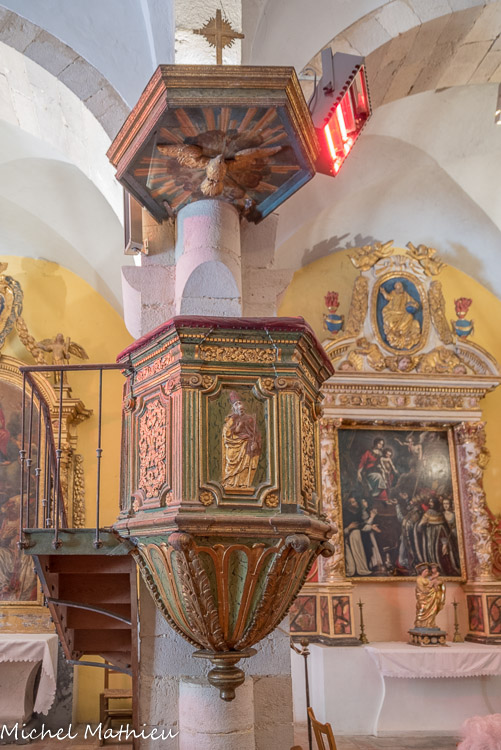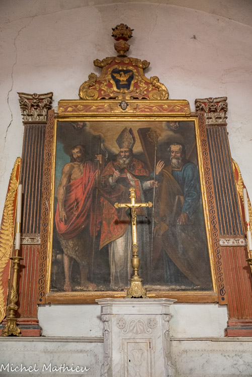 L'église Saint-Cassien. La Vierge à l'Enfant, entourée par Saint Cassien (?) et Saint Maxime. En haut Dieu le Père et la Colombe du Saint Esprit.