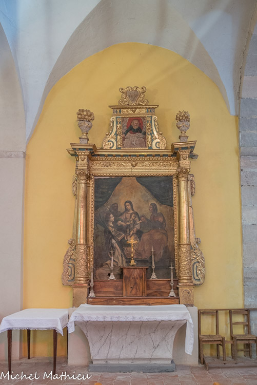 Tableau : la Sainte Famille avec sainte Anne et une sainte martyre, au fond, st Joseph, avec au-dessus Dieu le père et le saint Esprit.