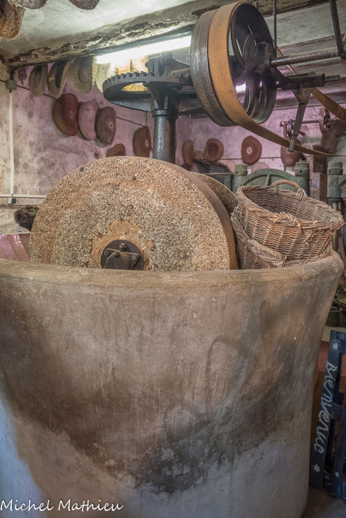 Le moulin à huile. Moteur et courroies d'entrainement.