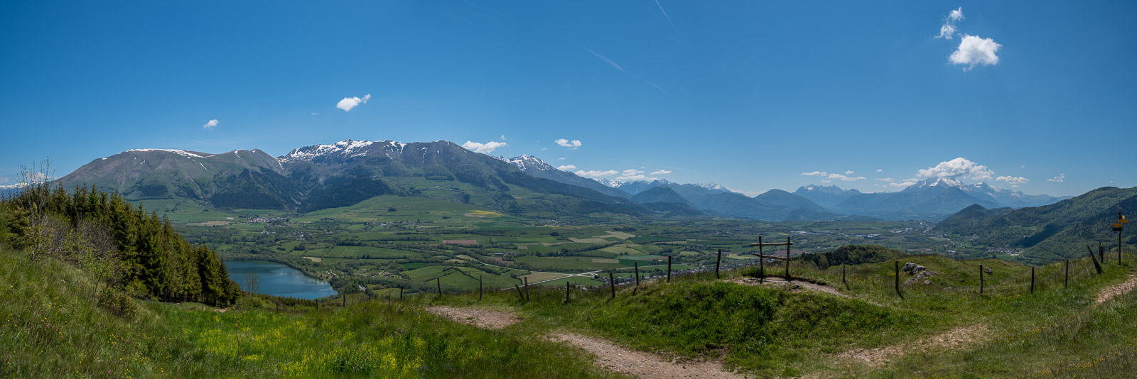 Le Lac de Pierre Châtel. Tout à gauche, le massif de Belledonne. Le Grand Serre, et à droite, le Tabor.
