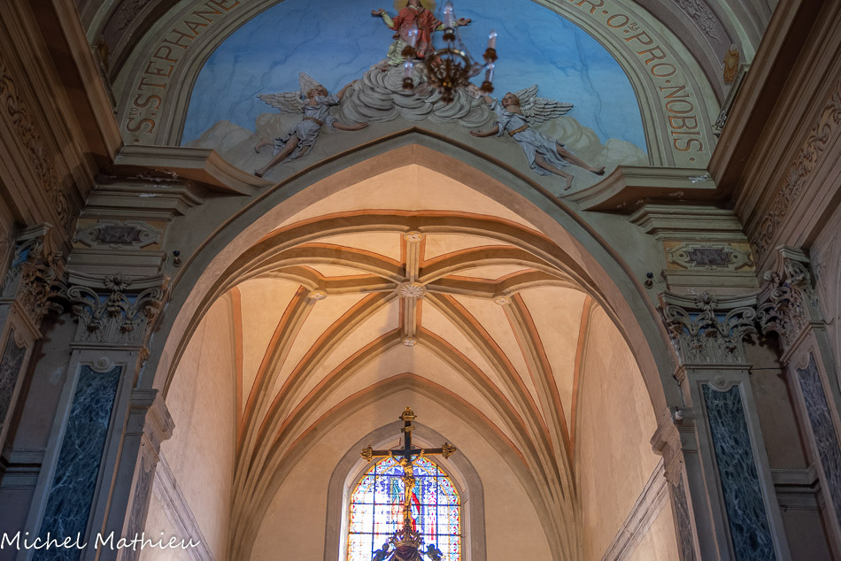 Église paroissiale Saint Étienne. La voûte est supportée par des nervures, liernes, tiercerons et formerets engagés dans les murs. Les clés sont plates.