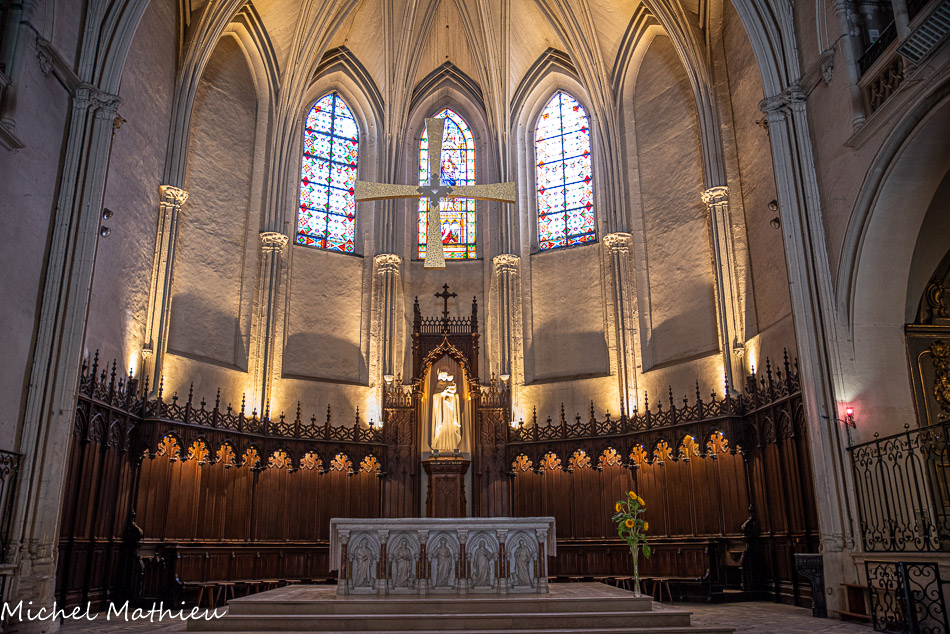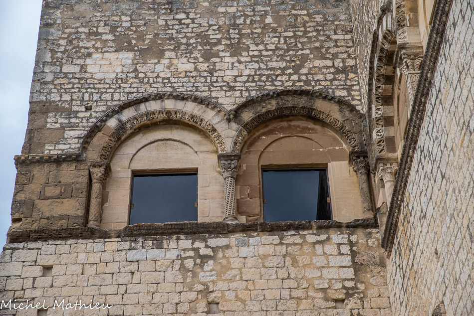 L’enfilade des neufs fenêtres en plein cintre de l’étage supérieur offre à l’amateur d’art un décor riche et varié. Ces fenêtres sont ornées d’une archivolte constituée de claveaux bicolores retombant sur des colonnettes alternativement " rondes et carrées.