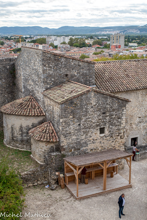 Vue du chemin de ronde. Logis seigneurial. Bâti au 12e siècle par Géraud Adhémar, ce corps de logis au décor prestigieux s'élève sur deux niveaux au milieu d'une cour. Au sud-est, une aile est bâtie contre le logis au 13e siècle. Elle comprenait une cuisine avec cheminée et à l'étage supérieur une chambre et des latrines.
