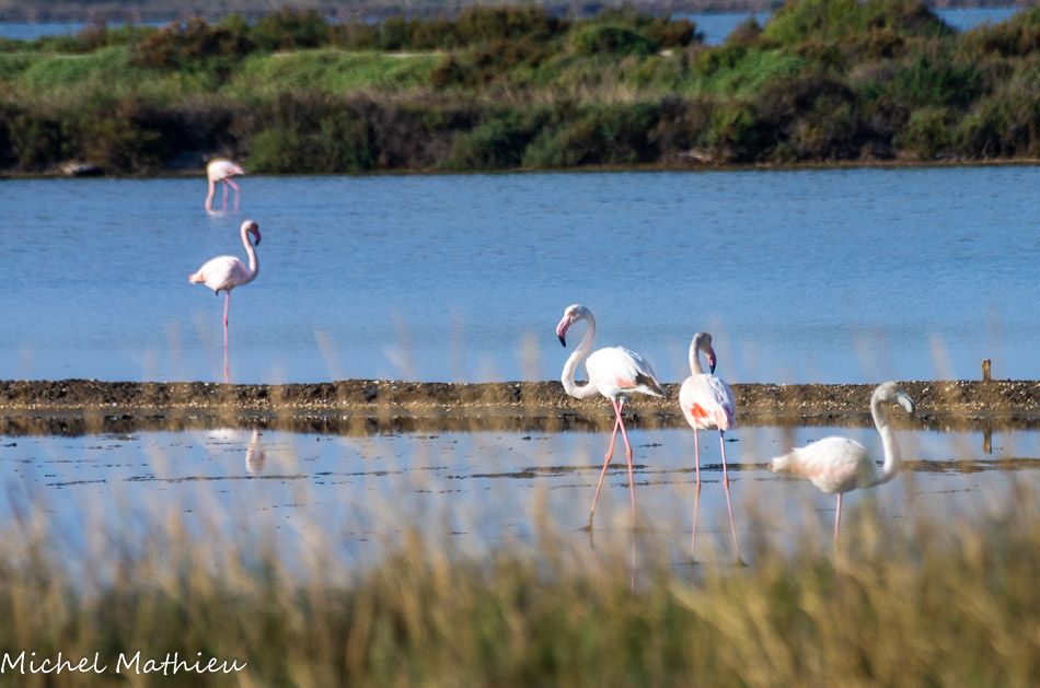 Flamants roses. Leur couleur vient des pigments caroténoïdes présents dans les algues et les crustacés qu'ils consomment.