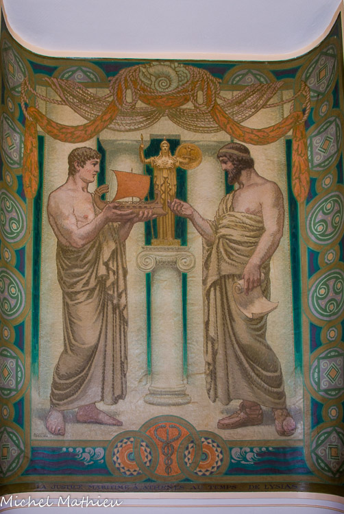 Bureau du président. La première toile marouflée, la justice maritime à Athènes au temps de Lysias,signé Marcel Poggioli montre le célèbre recteur Lysias (vers 440 vers 380 avant JC) tenant le rouleau de l'un de ses discours à la main face à un personnage drapé d'une toge qui tend la maquette d'une trière ; la scène se déroulant devant une statue d'Athéna