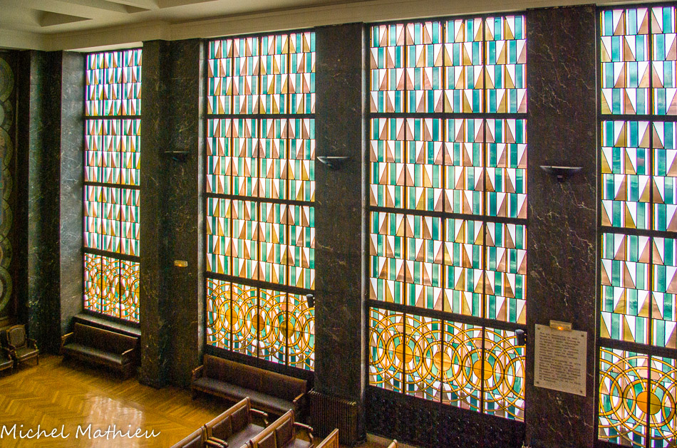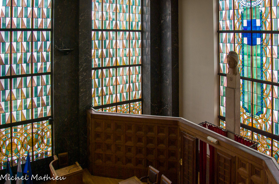 Grande salle d'audience. Vitraux aux motifs géométriques.