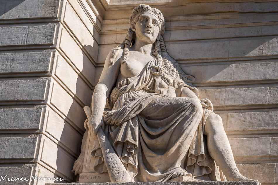 Statue de Thémis, déesse de la justice de la loi et de l'équité sculptée en 1933 par Henri Raybaud. Cette allégorie inspirée des koré de la statuaire grec archaïque, tient dans sa main gauche la loi, sa main droite posée sur un glaive.