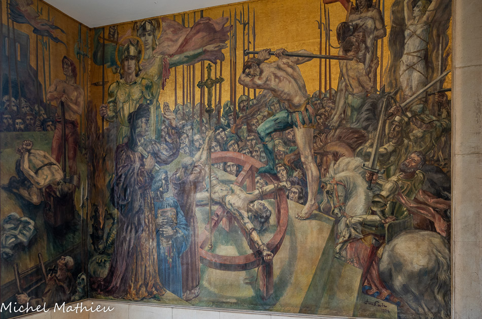 A l’intérieur du hall, les murs sont ornés de grands panneaux de Jean Lair intitulés l'Abolition des peines corporelles sous la révolution française : le bûcher des sorcières la pendaison, le passage à la roue, la décollation, l'ordalie (appelé jugement de Dieu), l'écartèlement, le tribunal de l'inquisition.