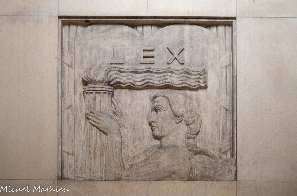 Cette sculpture de Sartorio représente la Loi sous les traits d'une femme portant le flambeau civilisateur du droit, devant les tables de la loi. A l’arrière-plan, les faisceaux des licteurs symbolisent l'application de la loi.