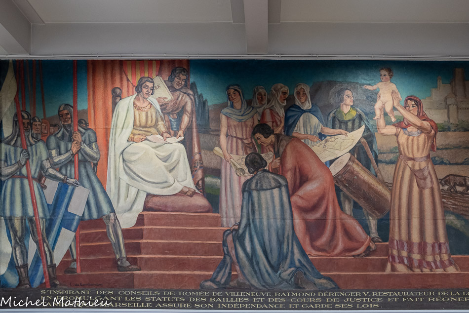 Panneau décoratif de Louis de Lombardon intitulé le Comte de Provence Raymond Béranger V donne les lois à la Provence. Le comte, assis sur son trône, donne audiences à ses baillis. À sa gauche, portant les attributs de la loi se trouve son conseiller, Romée de Villeneuve. Louis de Lombardon souhaita évoquer ici l'édification des cours de justice par le comte de Provence. Au centre de la toile sont figurées ses quatre filles. Leurs mariages assureront à Raymond Béranger une stabilité politique sans pareille.
