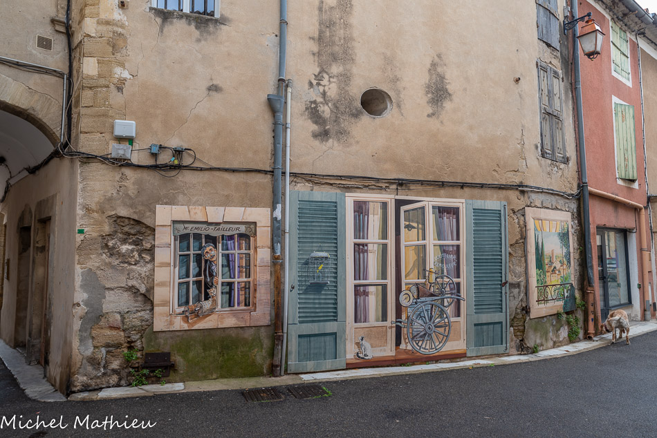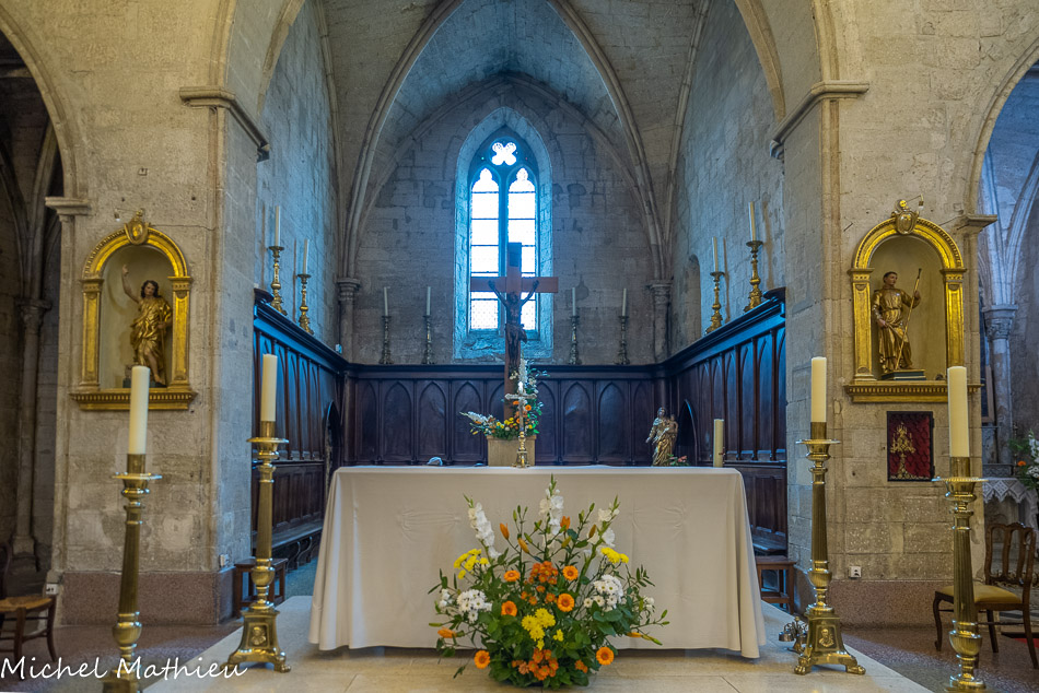 L'église Notre-Dame de Nazareth. Des boiseries en noyer au-dessus des stalles tapissent les murs jusqu’à trois mètres de hauteur. Ces stalles ont été probablement réalisées, comme celles de Saint Siffrein à Carpentras, en 1843 par Leytier, ébéniste à Monteux. Au fond, une très belle statue de la Vierge.