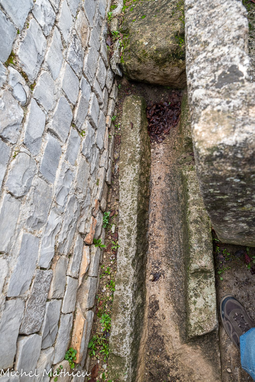 Maison au Dauphin (Ier s. av. J.-C. - IIe s. ap. J.-C.) L'atrium est la partie d’une maison antique romaine constituée d’une cour intérieure et le plus souvent entourée d’une galerie couverte et soutenue par deux rangées de colonnes, galerie que l’on nomme portique, commandant la distribution de la maison romaine. Au centre, l'impluvium. Sur les deux supports, une tablette sur laquelle on posait des objets de valeurs.
