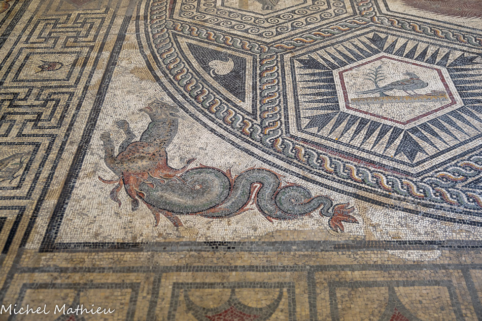 Ce pavement mosaïqué décorait la salle centrale de 1 aile nord de la Maison du Paon. Il s’agit d’un travail de belle facture réalisé avec une pose soignée à grande concentration de tesselles ; les plus petites (2 mm de côté) affinent le dégradé dans les décors polychromes les plus raffinés comme la panthère marine qui ornait à l’origine les quatre écoinçons.