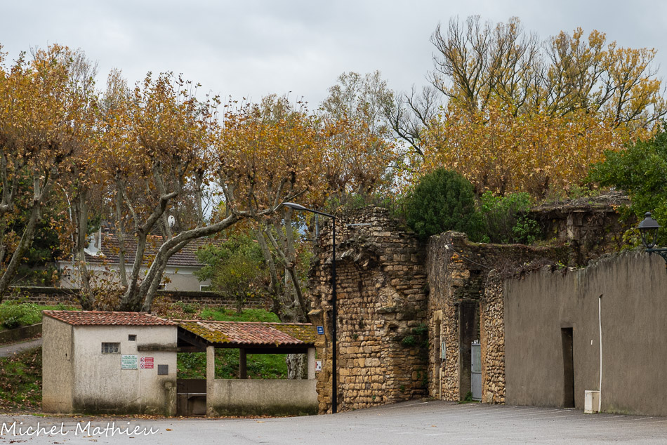 restes des remparts du XIVe, avec le lavoir. L’ouvrage a été construit en pierres dures de Courthézon sur une hauteur de 5 mètres et 1,50 mètre de largeur sur la base. Le premier seigneur de Caderousse fut Ripert de Cadarossa (de Caderousse). Puis sur les 33 co-seigneurs ayant participé à la vie de la commune, deux furent illustres : Les maisons d’Ancezune et Reynnaudi. Quant aux Gramont, ils furent les descendants au 5e degré de la famille d’Ancezune.