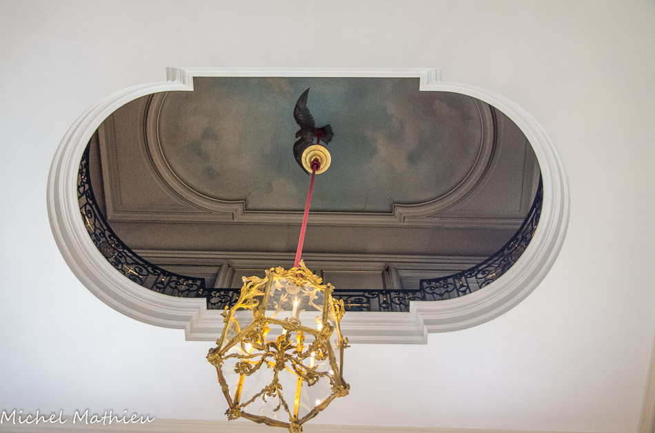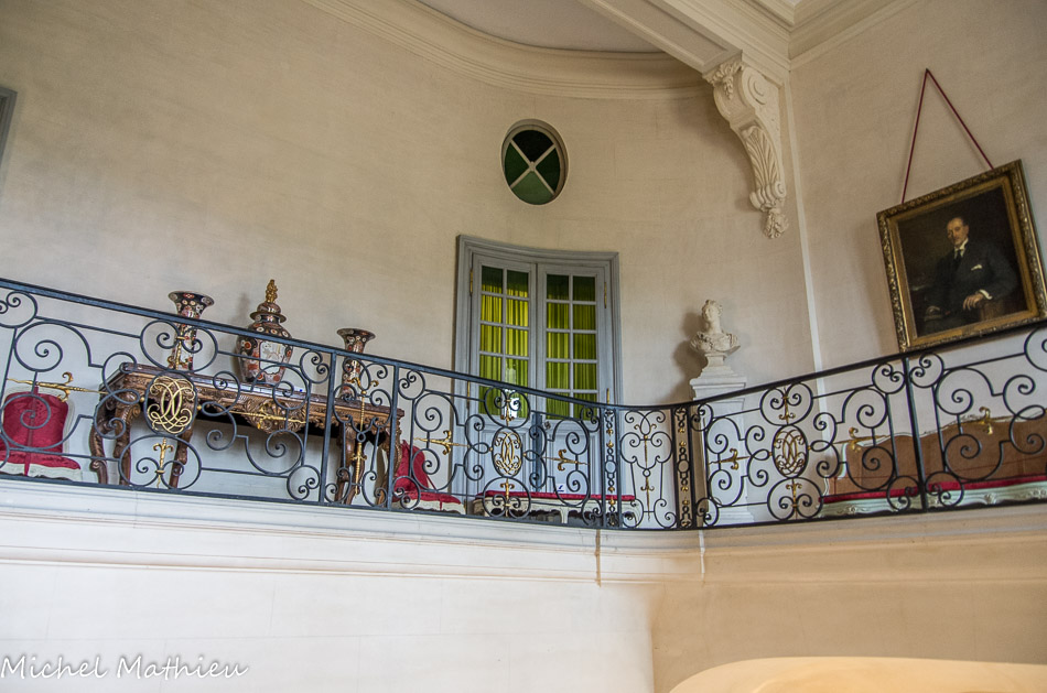 Escalier d'honneur. Mezzanine où les musiciens s'installaient pour accueillir les invités en musique, sans être vus.