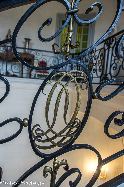 Escalier d'honneur. La rampe est ornée du chiffre « LC » de Louis Cahen.