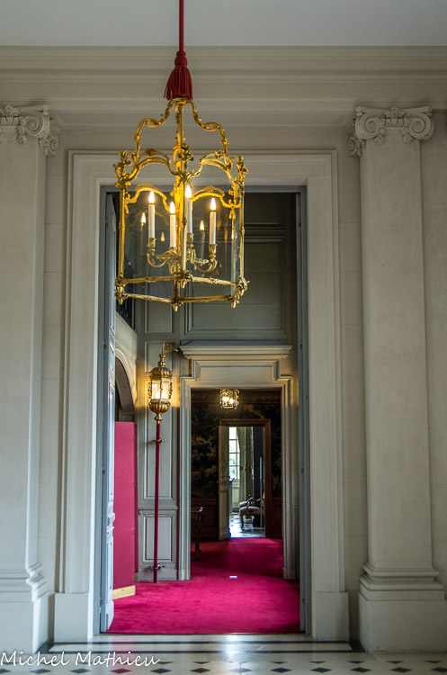 L’escalier rouge. Cet escalier dessert tous les étages, contrairement à l’escalier d’honneur. L’éclairage est assuré par des torchères vénitiennes avec le lion de saint Marc en bannière.