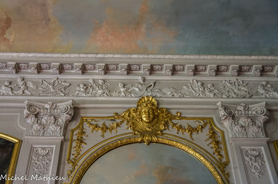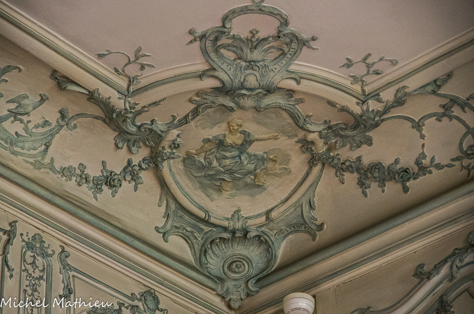 Salon de musique. Si les boiseries ont été dessinées par Bullet de Chamblain, l’architecte Destailleur a repris la décoration haute de cette salle, encadrée par 16 pilastres. Le ciel en trompe-l’œil ainsi que la répétition du motif des musiciens sur la frise de la corniche datent donc des Cahen d’Anvers et rappellent le goût de cette famille pour la musique.