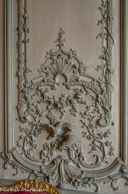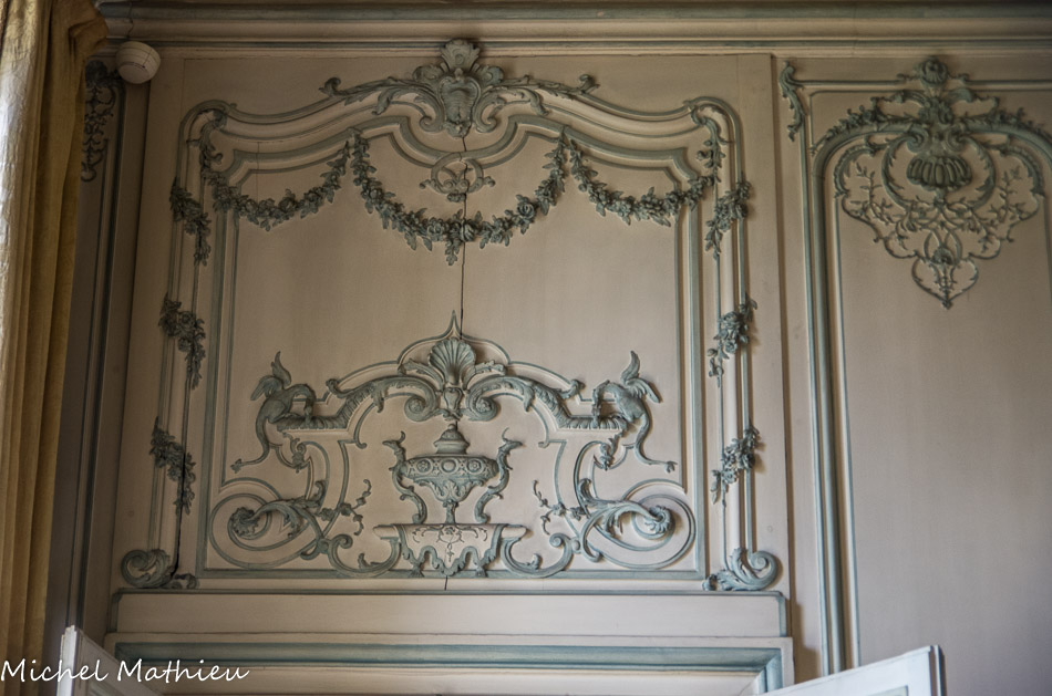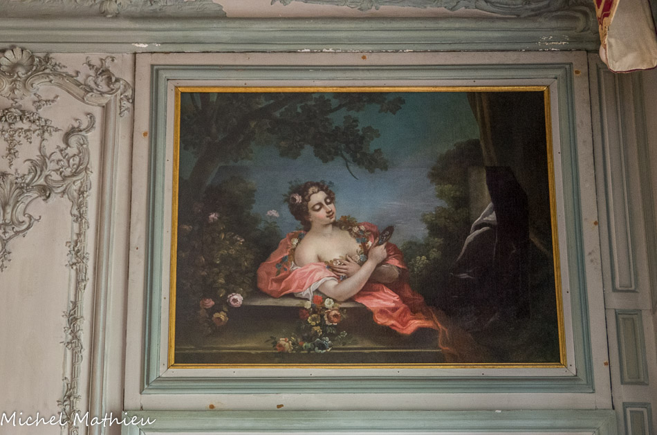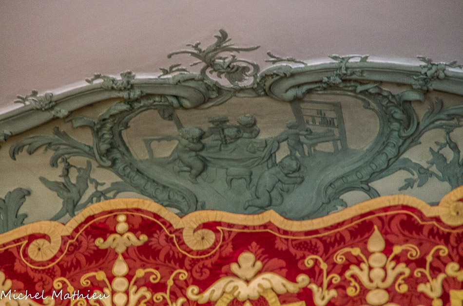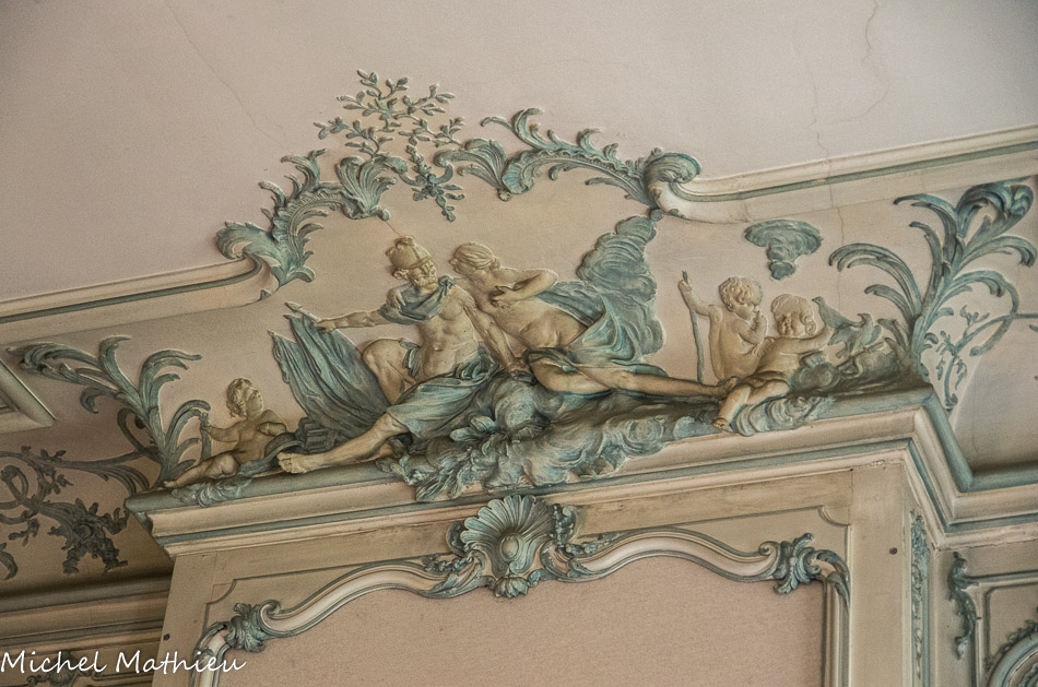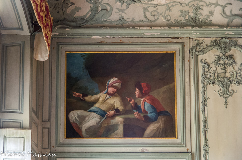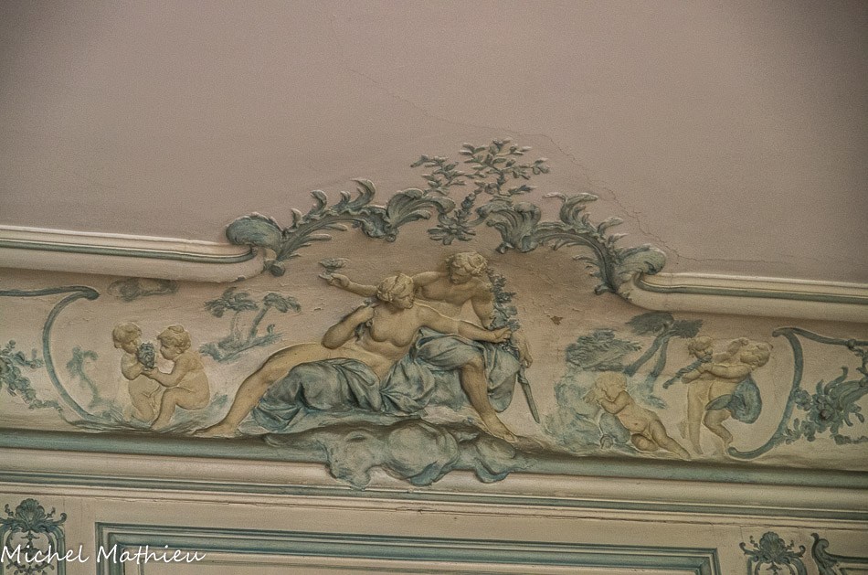 Chambre des anciens propriétaires donateurs. En 1895, Walter Destailleur fait remettre des boiseries de style XVIIIe siècle, en s’inspirant de la décoration du château. Sur la corniche, Destailleur fait sculpter de nombreux couples de la mythologie grecque :