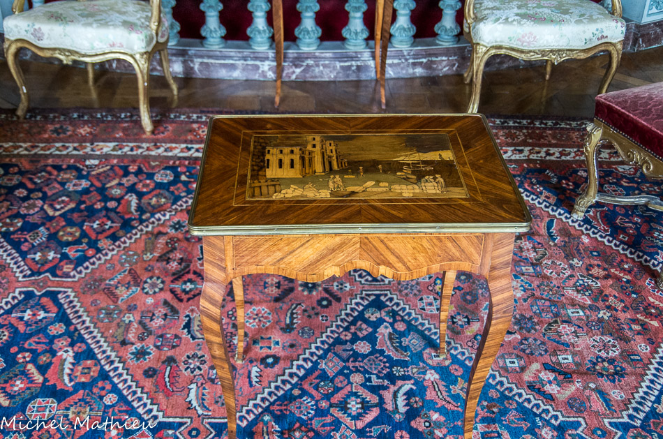 Le mobilier de la pièce est riche : des fauteuils Louis XV dont l’un est estampillé du menuisier Georges Jacob, fournisseur de Marie-Antoinette. À droite, un canapé et deux fauteuils Louis XV sont garnis d’un tissu de damas de soie rouge.