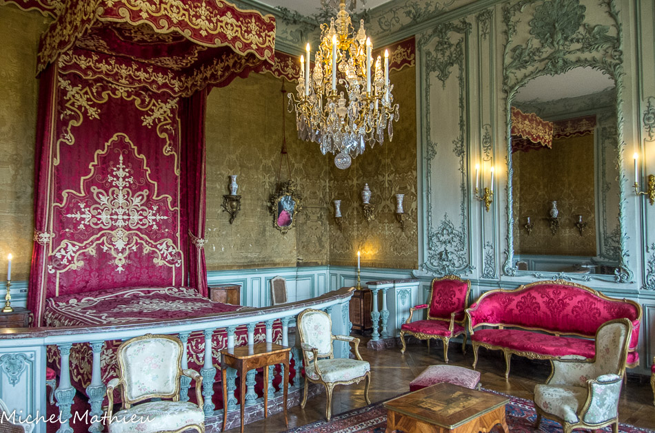 Chambre d'honneur aménagée comme une chambre d'apparat du 18 ème siècle. À l’origine chambre usuelle, cette pièce est décorée en 1740 par le second duc de la Vallière dans le style rocaille, en vogue sous le règne de Louis XV ; l’auteur des boiseries reste encore mystérieux. Mais les colombes sculptées, les queues de paons, les frises de bois qui s’enroulent autour des miroirs font de cette pièce un véritable décor de théâtre amoureux qui n’est pas sans rappeler la passion du duc de la Vallière pour le théâtre. Au XIXe siècle, la pièce sert de chambre d’enfant. Lorsque les Cahen d’Anvers s’installent, ils font de cette chambre une chambre d’honneur, comme le veut l’usage dans certains châteaux. Ils remettent un tissu du XVIIIe siècle dans l’alcôve. Ils ajoutent une balustrade acquise dans un château bourguignon. Ils font construire un lit à la duchesse, recouvert de damas rouge avec des applications de galons jaune et blanc. Cette mise en scène d’un XVIIIe siècle fantasmé permet de transformer cette chambre en véritable chambre royale. Devant la cheminée, on peut voir une duchesse brisée. À gauche du lit, un bonheur du jour de Charles Topino est décoré d’une marqueterie de tasses, soucoupes, vases et fleurs.