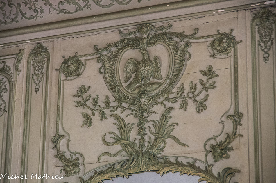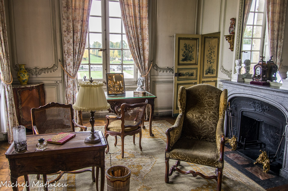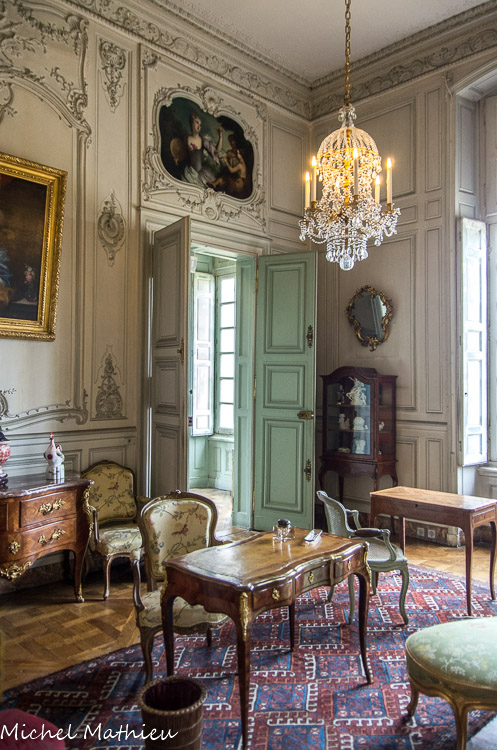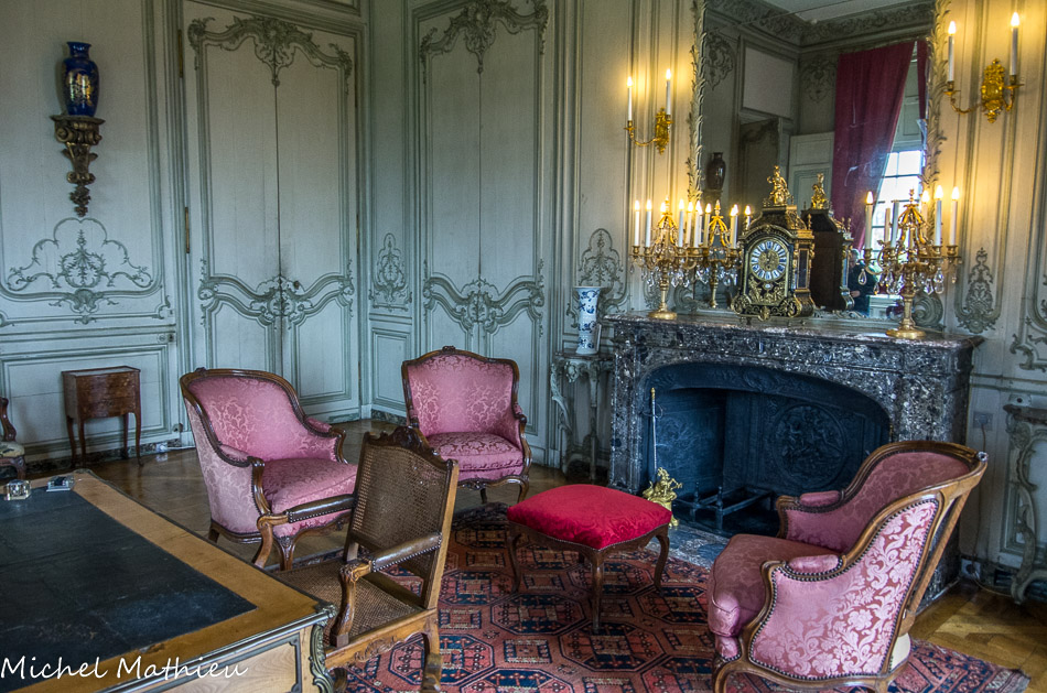 Salon d'angle transformé en bureau. Les boiseries finement sculptées de feuillages, de palmes et d’aigles au-dessus des trumeaux furent réalisées pour le second duc de la Vallière.