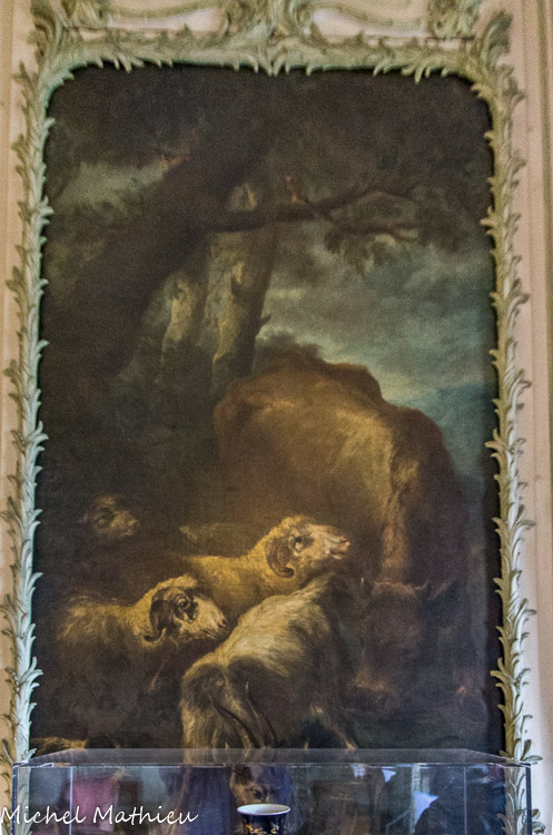 Salon d'angle transformé en bureau. Les miroirs sont remplacés par des toiles de Rosa de Tivoli (1655-1706), un Allemand vivant en Italie et spécialisé dans la peinture animalièr