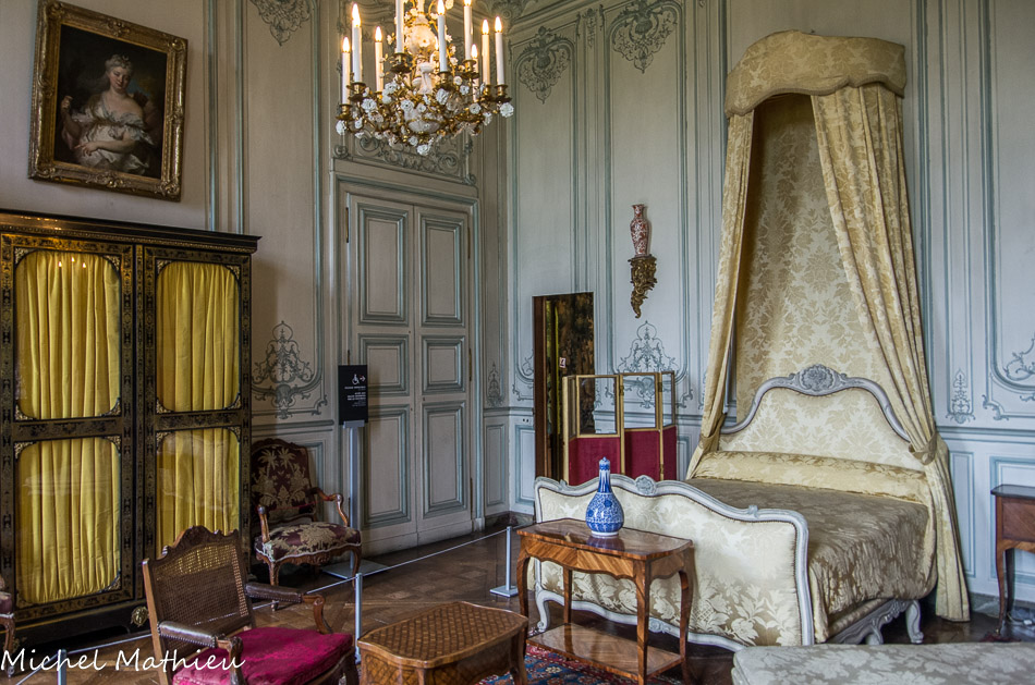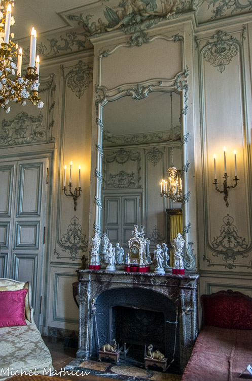 La chambre grise. Les boiseries de cette chambre à coucher sont réalisées pour le duc de La Vallière dans les années 1740. Leurs lignes courbes et leurs motifs ondulants sont un bon exemple du style rocaille. Des instruments de musique sont sculptés de part et d'autre de l'alcôve, où est disposé le lit Au-dessus des portes, deux toiles du 18e siècle représentent des personnages s'adonnant à la musique et à la danse. Cette chambre est complétée par une salle de bains aux sobres boiseries vertes.