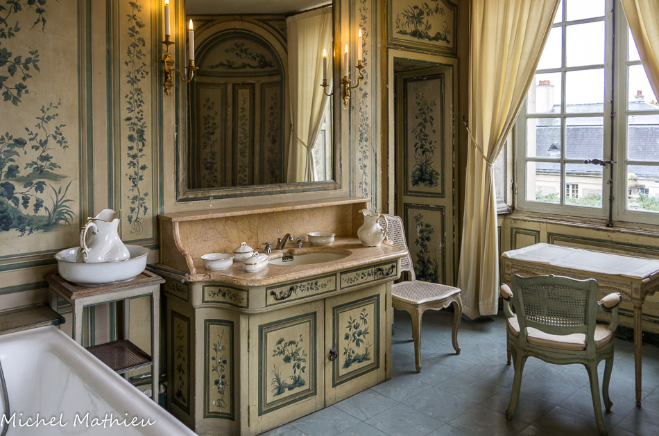 La salle de bains de la chambre de Madame. . La niche dans l’angle était déjà là au XVIIIe siècle et accueillait déjà une chaise d’affaires. Sous le plateau en bois, les Cahen d’Anvers aménagent une cuvette de toilette reliée au tout-à-l’égout.