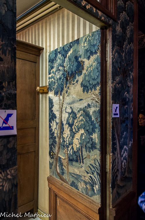Le couloir illustre le choix des Cahen d'Anvers de recouvrir la totalité des murs avec des fragments de tapisseries d'Aubusson. Ces verdures du XVIIe siècle représentent des paysages.