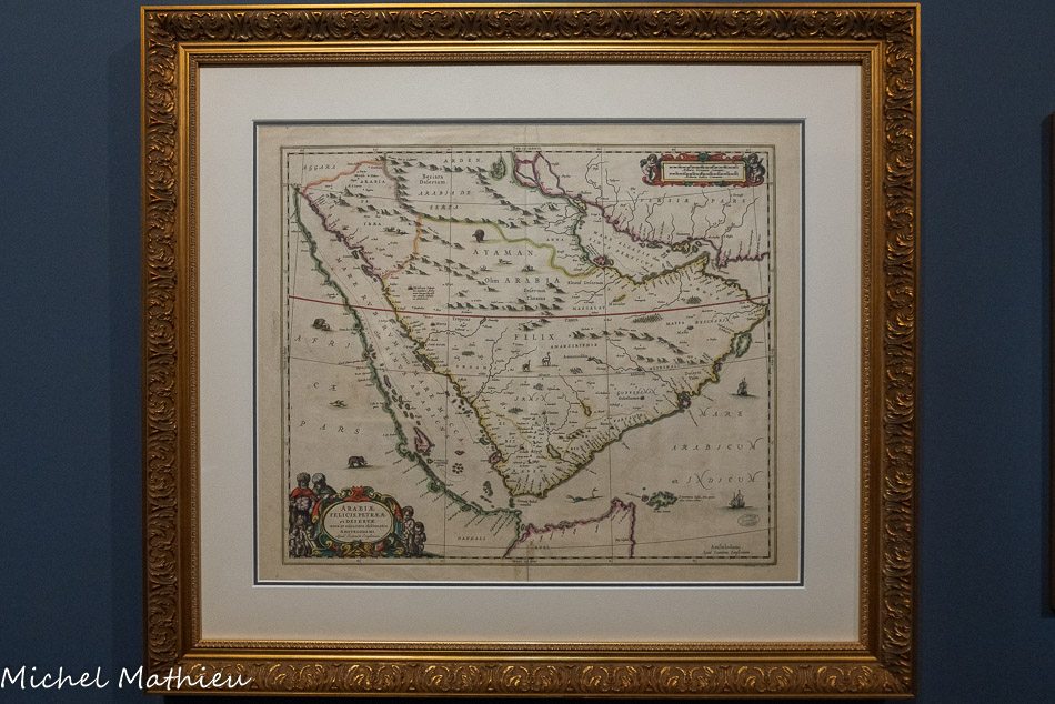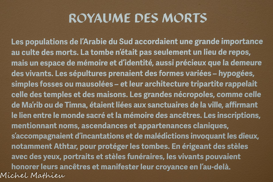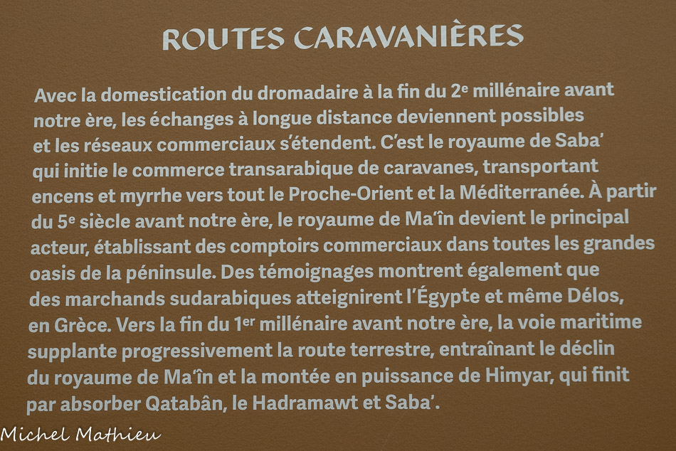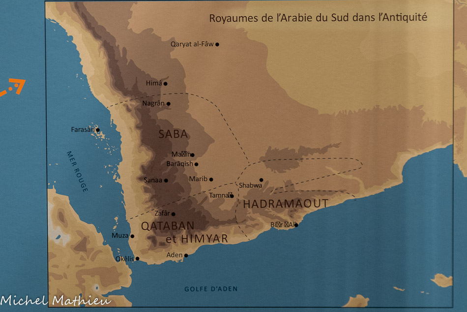 Ce dossier de trône en albâtre, provenant de Mâ'rib, ancienne capitale du royaume de Saba, porte une inscription sudarabique en langue sabéenne gravée en boustrophédon, encadrée par huit bouquetins, symboles du dieu Almaqah auquel il est dédié.