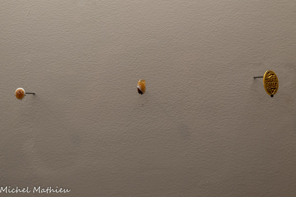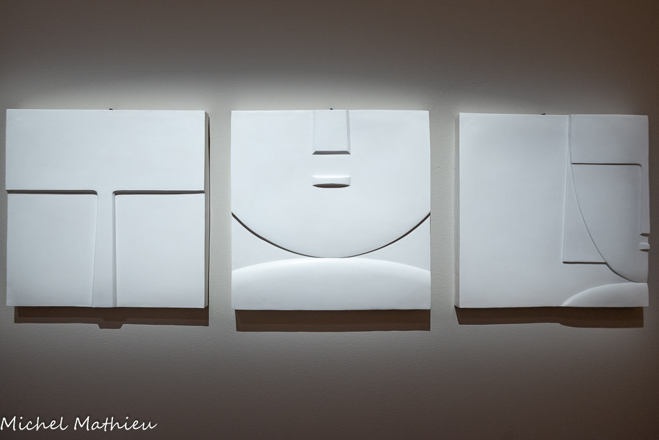 (1980, vit en France). Collection de l'artiste. Terre patinée Plâtre. La série «Cadrages » est née d'un jeu sur la notion de détail : chaque carreau est un cadrage plus ou moins serré d'une pièce inspirée de la statuaire sud-arabique antique. Elle découle d'un travail à la fois photographique et de composition graphique Le choix du plâtre comme matériau, avec sa finesse de sculpture et la nuance de ses ombres, évoque l’épure sereine des stèles funéraires et l’évidence qui se dégage de leur simplicité.