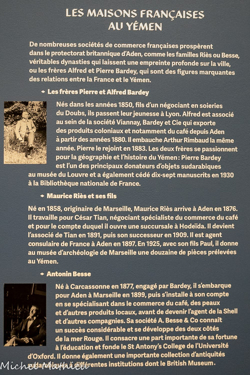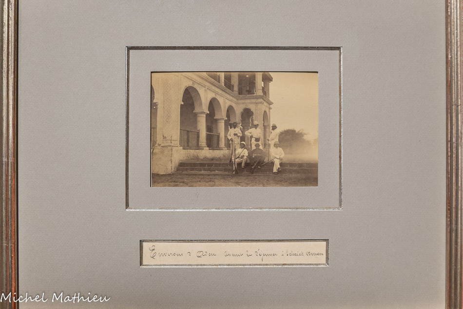 L'image montre un groupe de six personnages posant sur les marches de la demeure de Hassan Ali à Sheikh Othman, à quelques kilomètres d'Aden. Parmi eux, en haut à gauche, tête nue, Arthur Rimbaud.